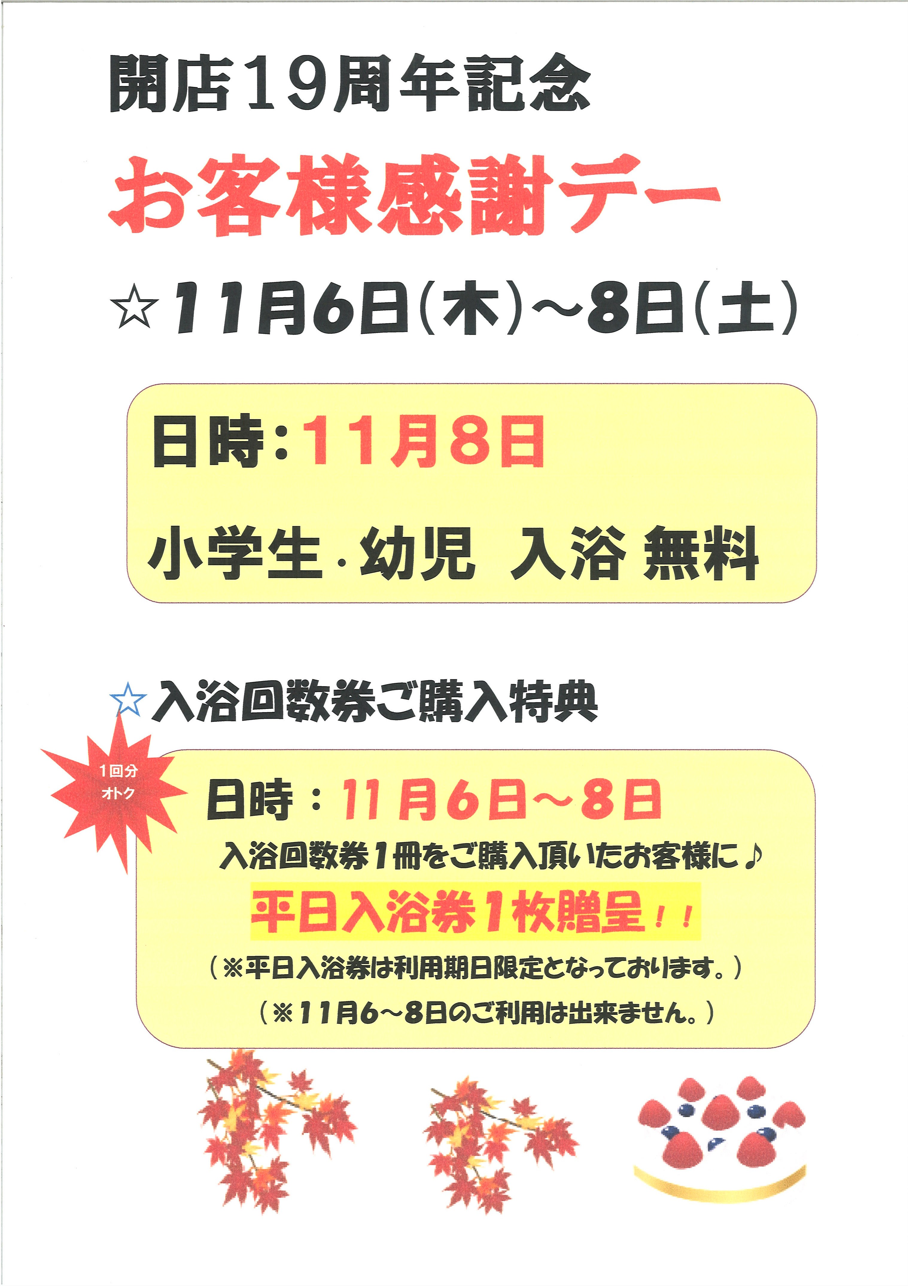 いつも「のつけ乃湯」をご利用いただき、誠にありがとうございます。おかげさまで当店は開店より19周年を迎えることができました。日頃のご愛顧に感謝を込めて、ささやかながら下記の通りお客様感謝デーを開催いたします。